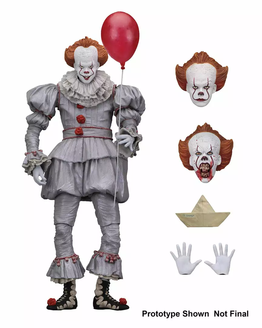 From the acclaimed 2017 horror film IT, drawn from the pages of Stephen King’s original novel, NECA presents the definitive version of Pennywise in action figure form!Based on Bill Skarsgård’s portrayal of the nightmare-inducing clown, this 7” scale figure has been painstakingly detailed to be as accurate to Pennywise’s ornate costume as possible. To recreate the most terrifying scenes from the movie, the fully articulated figure features three interchangeable heads, interchangeable hands, red balloon and paper boat. Comes in collector-friendly deluxe window box packaging with opening flap