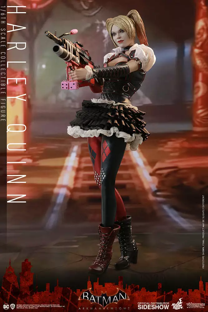 Masterfully crafted based on Harley Quinn’s appearance in the video game, the figure features a newly developed head sculpt with white powdered make up, blonde hair sculpture and moveable pigtails, newly developed body, Harley Quinn’s dramatic outfit consisting of a corset with black ruffle skirt and lace details, red and blue boots and arm-bracers, amazingly-detailed accessories including a baseball bat, machine gun, mallet, pistol, paint can with a brush, Jack-in-the-box, and a specially designed figure stand with the game logo.