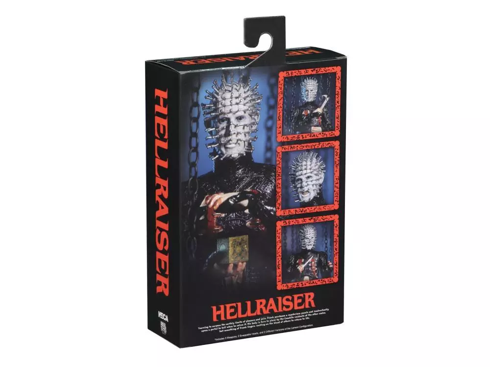 Clive Barker’s grisly horror masterpiece returns to NECA! The leader of the Cenobites himself is the latest addition to the Ultimates line. Pinhead features an all-new sculpt and tons of nightmarish detail, from the pins in his head to the tools of torture dangling over the soft goods vinyl skirt. The figure comes with 2 interchangeable heads and both open and closed Lament Configuration puzzle boxes. Display-friendly window box with opening flap.