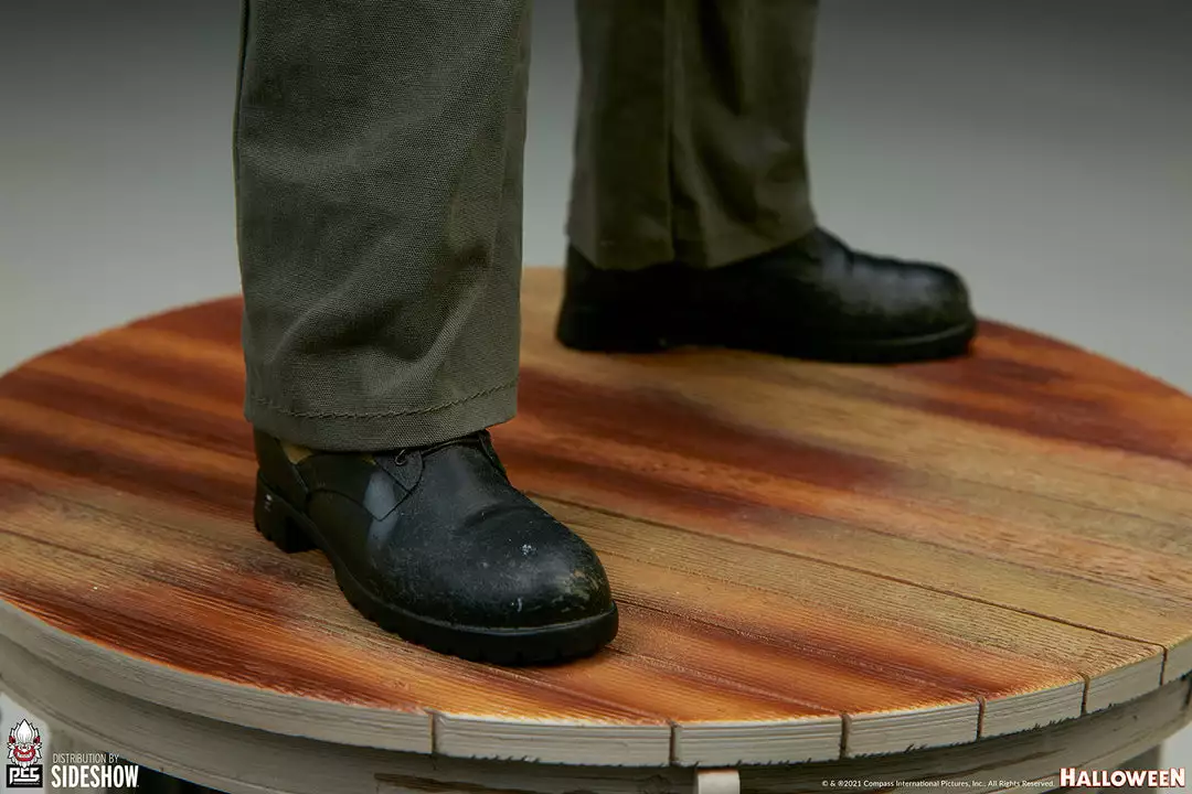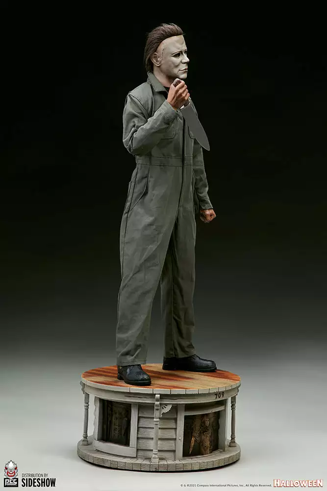 The Michael Myers Statue features a mixed media costume, including full fabric work coveralls, carefully tailored to capture the killer’s signature shape and size. The infamous Myers mask is sculpted onto his portrait and features synthetic hair elements that add a degree of frightening realism to this detailed figure.