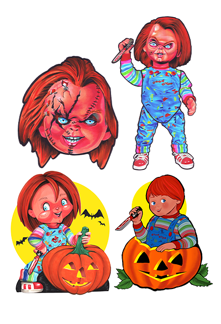 This amazing collection of wall decor comes with three static wall decor designs and one posable Chucky wall decor.