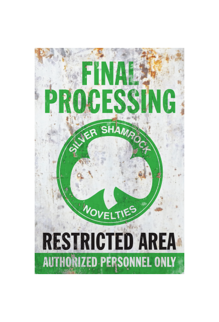 This sign, designed by the masters at Trick or Treat Studios, was made to look like it came right from the Silver Shamrock factory wall.