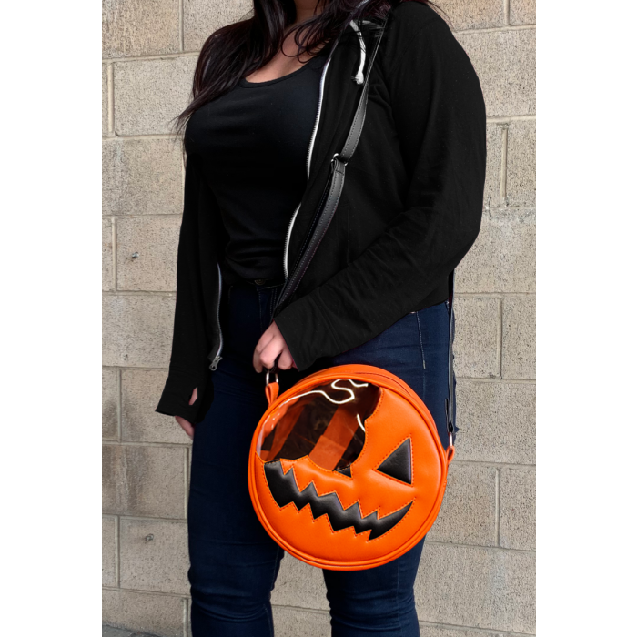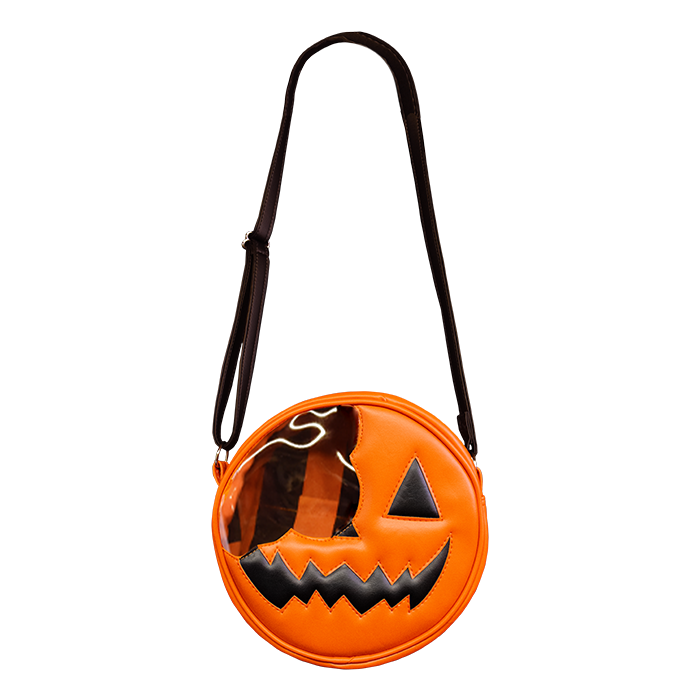Based on the Bitten Lollipop weapon used by Sam in the Cult Classic Trick r Treat, this bag the ultimate way to show your support of Sam throughout the Halloween Season. This incredible purse is made using the highest quality Vegan Leather for excellent durability. In addition, the purse has a soft black and orange stripped inner lining with a large center pocket, two side pockets, an adjustable strap and of course the front bitten window.